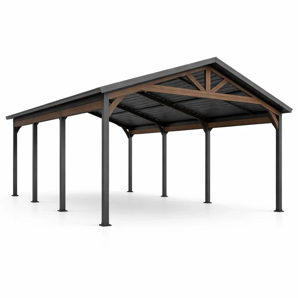 Carport in metallo con struttura in acciaio rosso e nero