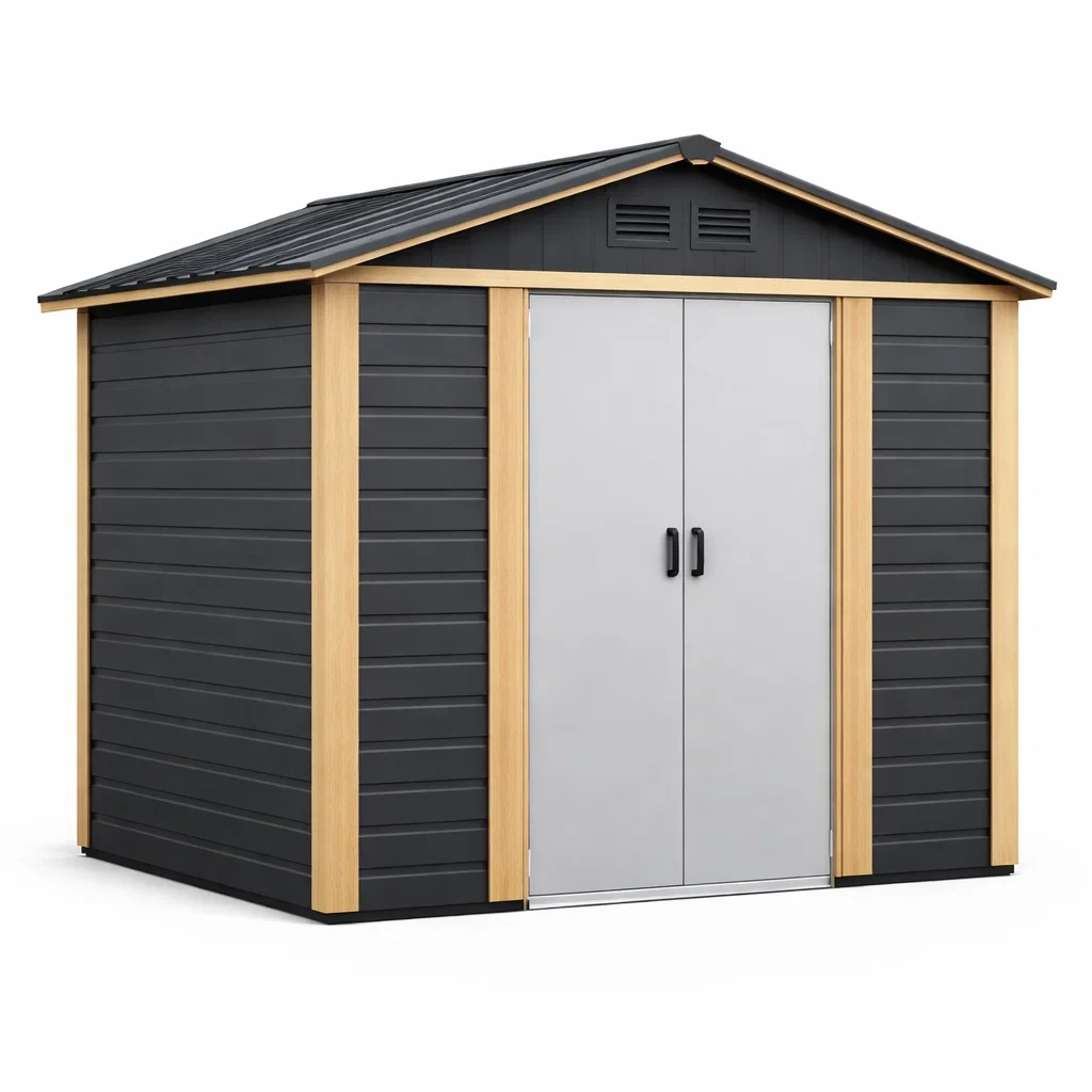 Il capanno da giardino è realizzato in polipropilene resistente e acciaio con trattamento superficiale verniciato.