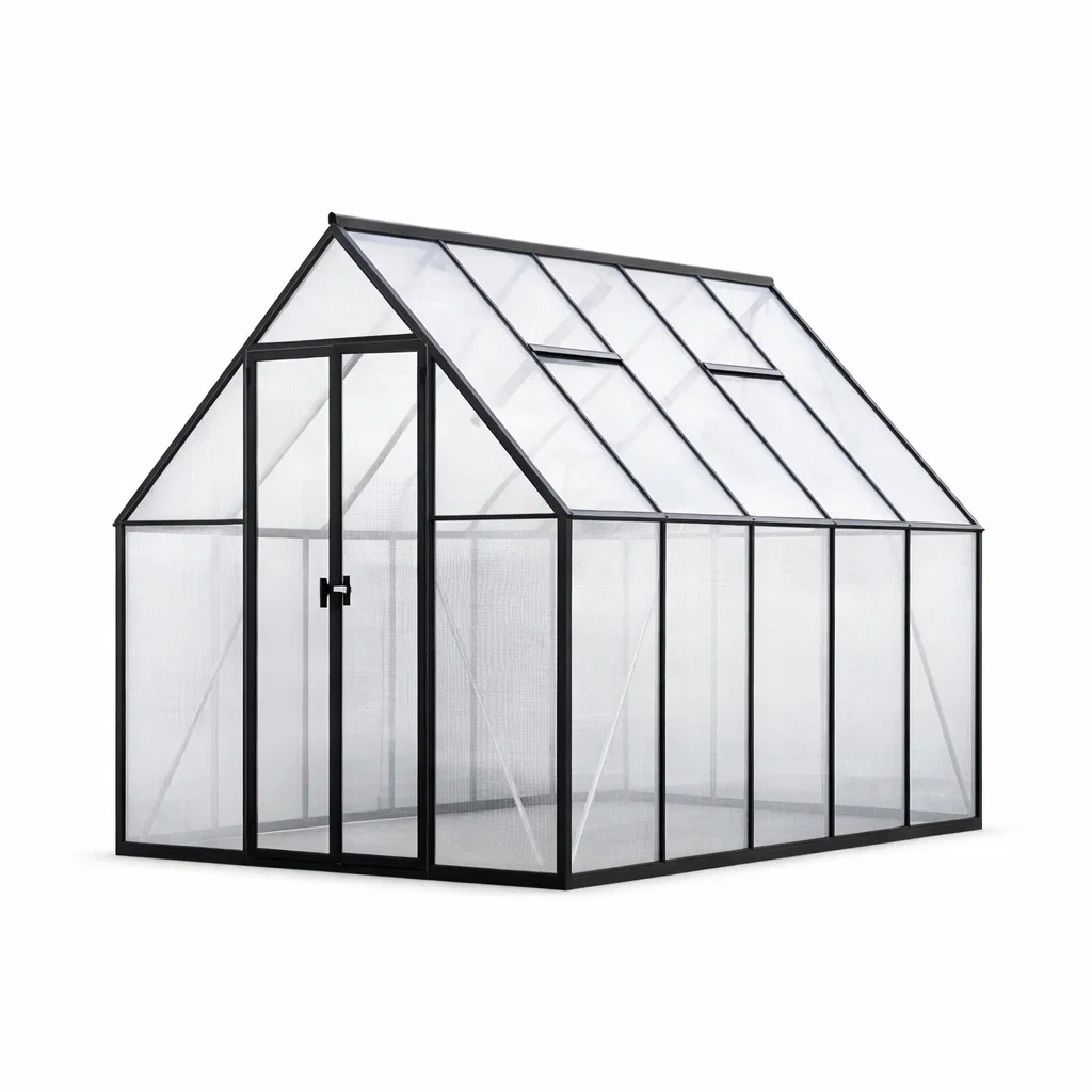 Questa serra da giardino presenta una struttura in alluminio resistente e pannelli in policarbonato trasparente con uno spessore di 6 mm. Le dimensioni sono di 250 cm di lunghezza, 185 cm di larghezza e 209 cm di altezza.