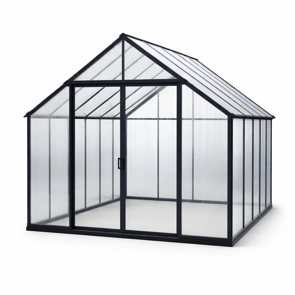Questa serra è realizzata con una struttura in alluminio e pannelli in policarbonato da 4 mm trasparente, progettata per resistere ai raggi UV e alle intemperie. La dimensione è di 250 cm di lunghezza, 200 cm di larghezza e 200 cm di altezza, con una superficie totale di 5 m². Dotata di una porta scorrevole di 100 cm di larghezza e 180 cm di altezza. La trasmissione della luce è dell'80%, garantendo un'illuminazione ottimale all'interno. Include aperture regolabili per la ventilazione.