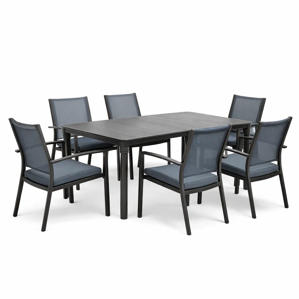 Set tavolo e sedie con tavolo rettangolare in alluminio e 6 sedie in tessuto blu