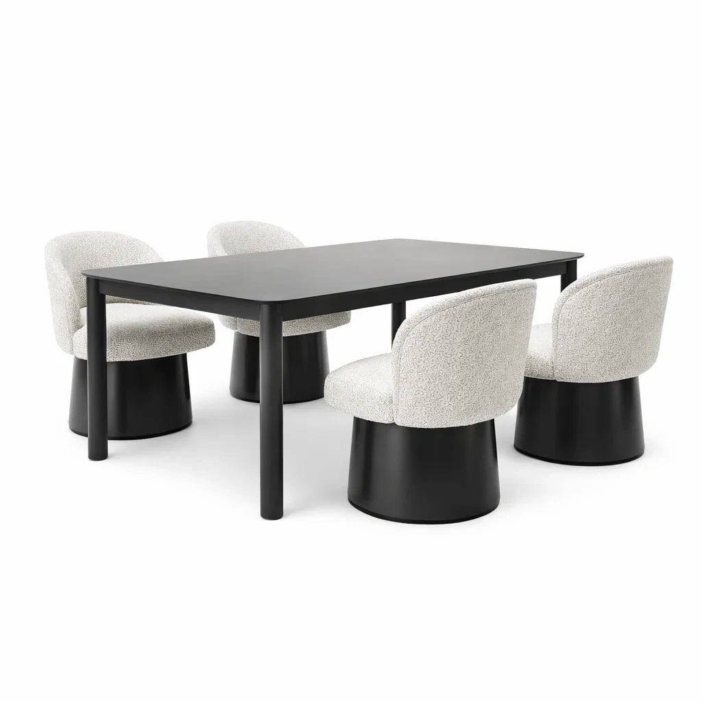 La struttura del tavolo è solida, con gambe quadrate, mentre le sedie presentano una base cilindrica e uno schienale curvo. Può ospitare comodamente quattro persone.