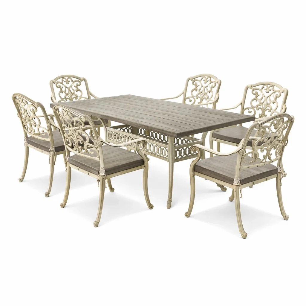 Set da pranzo composto da un tavolo e cinque sedie. Struttura in alluminio verniciato a polvere. Il piano del tavolo e le sedute sono in alluminio con finitura effetto legno. Dimensioni tavolo: lunghezza 180 cm, larghezza 90 cm, altezza 75 cm. Dimensioni sedia: altezza 95 cm, larghezza 55 cm, profondità 60 cm. Adatto all'uso esterno, resistente agli agenti atmosferici.